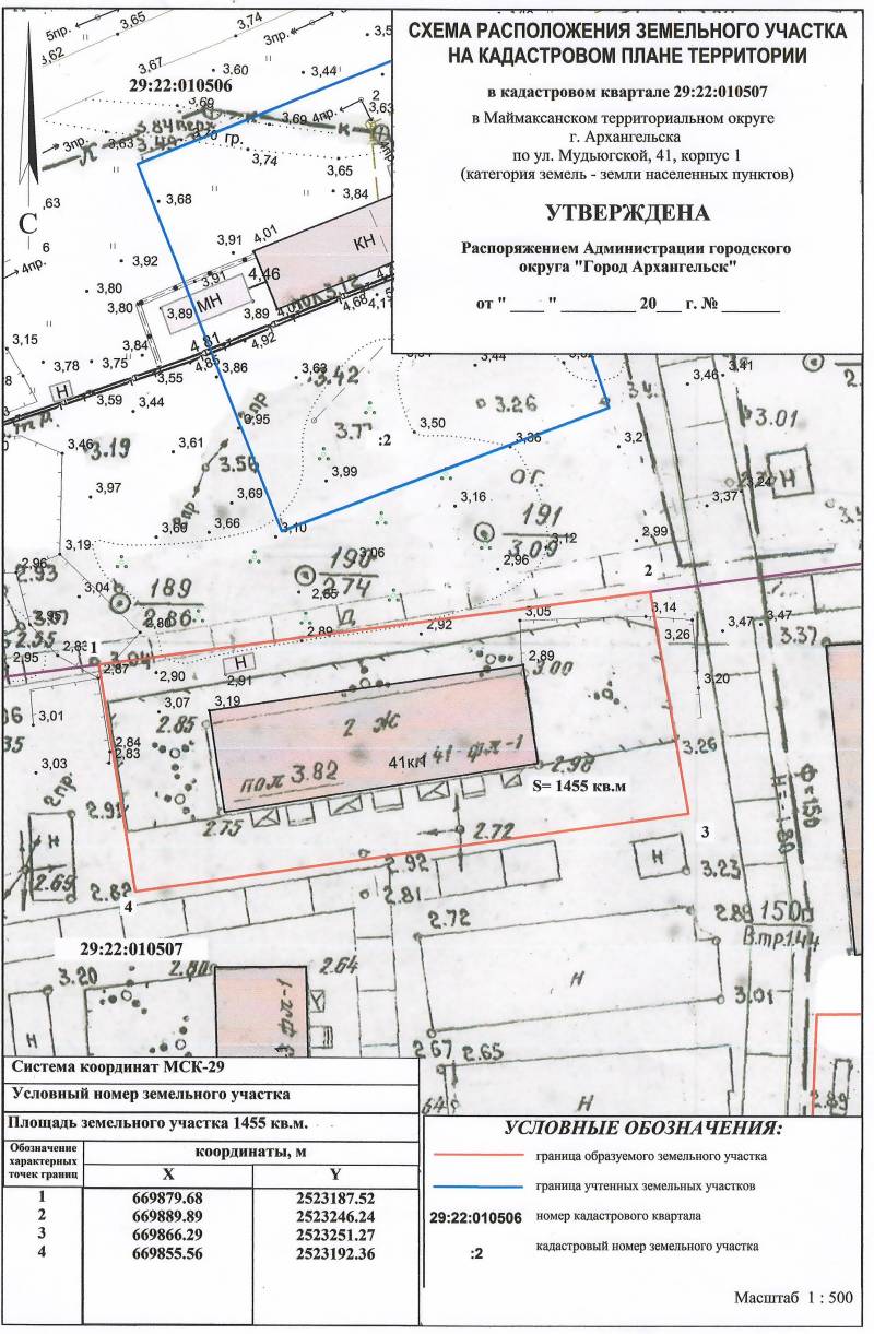 2. Адрес месторасположения земельного участка: г. Архангельск, ул. Мудьюгская, д. 41, корп. 1. Данный земельный участок расположен в кадастровом квартале 29:22:010507 Планируемая к утверждению схема расположения земельного участка: