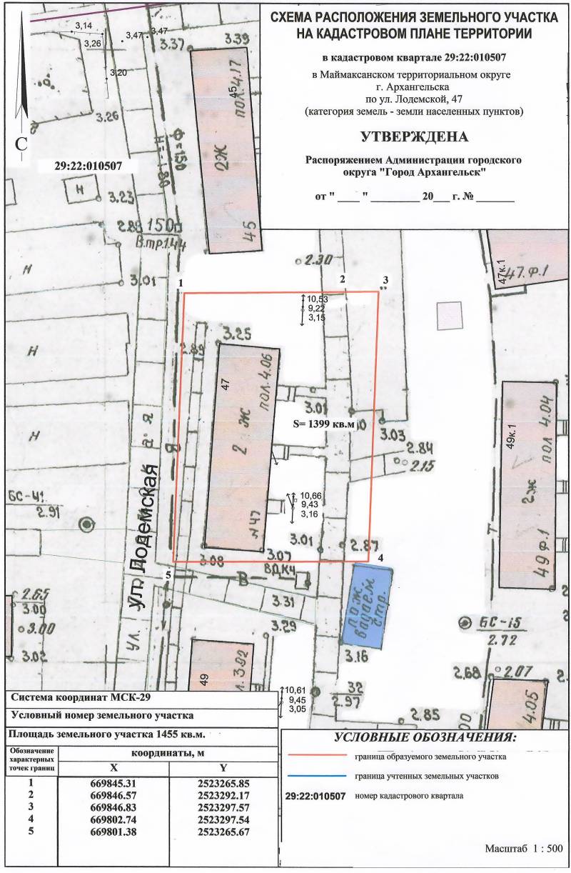 2. Адрес месторасположения земельного участка: г. Архангельск, ул. Лодемская, д. 47. Данный земельный участок расположен в кадастровом квартале 29:22:010507. Планируемая к утверждению схема расположения земельного участка: