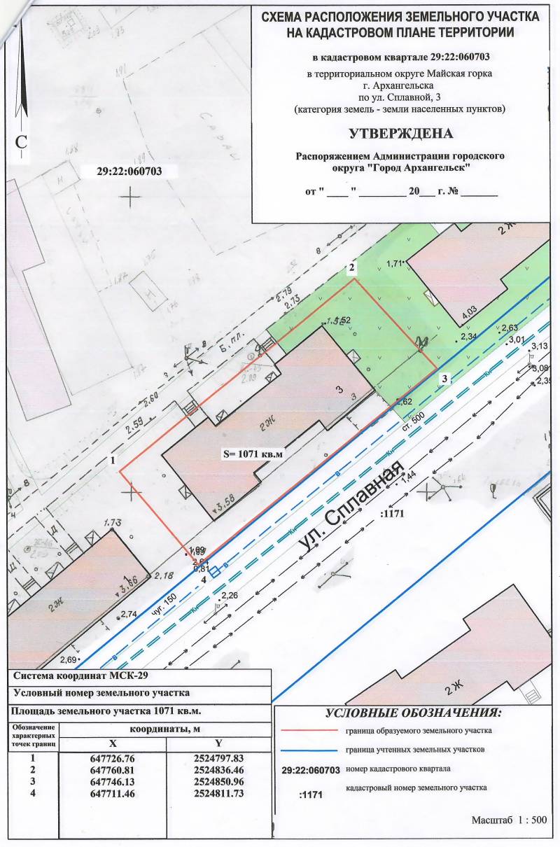 2. Адрес месторасположения земельного участка: г. Архангельск, ул. Сплавная, д. 3. Данный земельный участок расположен в кадастровом квартале 29:22:060703. Планируемая к утверждению схема расположения земельного участка: