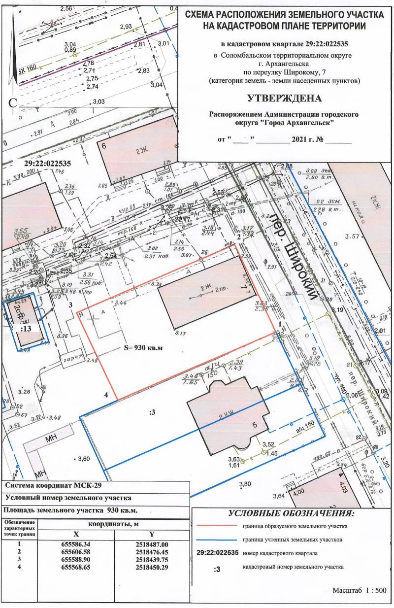 2. Адрес месторасположения земельного участка: г. Архангельск, пер. Широкий, д. 7. Данный земельный участок расположен в кадастровом квартале 29:22:022535. Планируемая к утверждению схема расположения земельного участка: