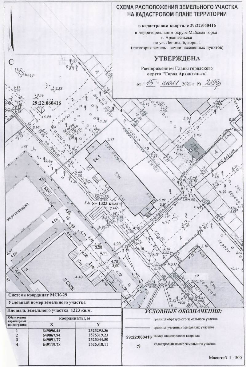 2. Адрес месторасположения земельного участка: г. Архангельск, ул. Ленина, д. 6, корп. 1. Данный земельный участок расположен в кадастровом квартале 29:22:060416. Утвержденная схема расположения земельного участка: