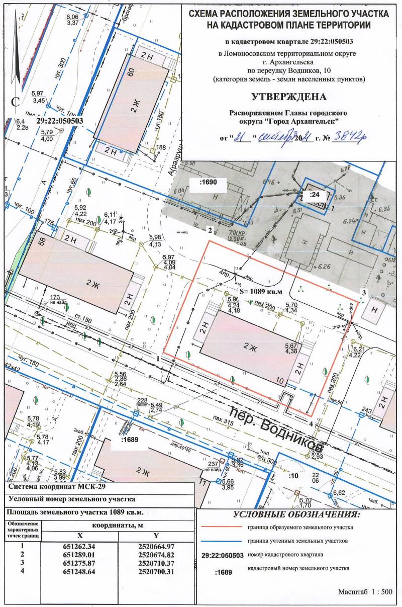 2. Адрес месторасположения земельного участка: г. Архангельск, пер. Водников, д. 10. Данный земельный участок расположен в кадастровом квартале 29:22:050503. Утвержденная схема расположения земельного участка:
