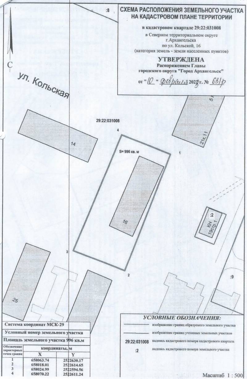 2. Адрес месторасположения земельного участка: г. Архангельск, ул. Кольская, д. 16. Данный земельный участок расположен в кадастровом квартале 29:22:031008. Утвержденная схема расположения земельного участка: