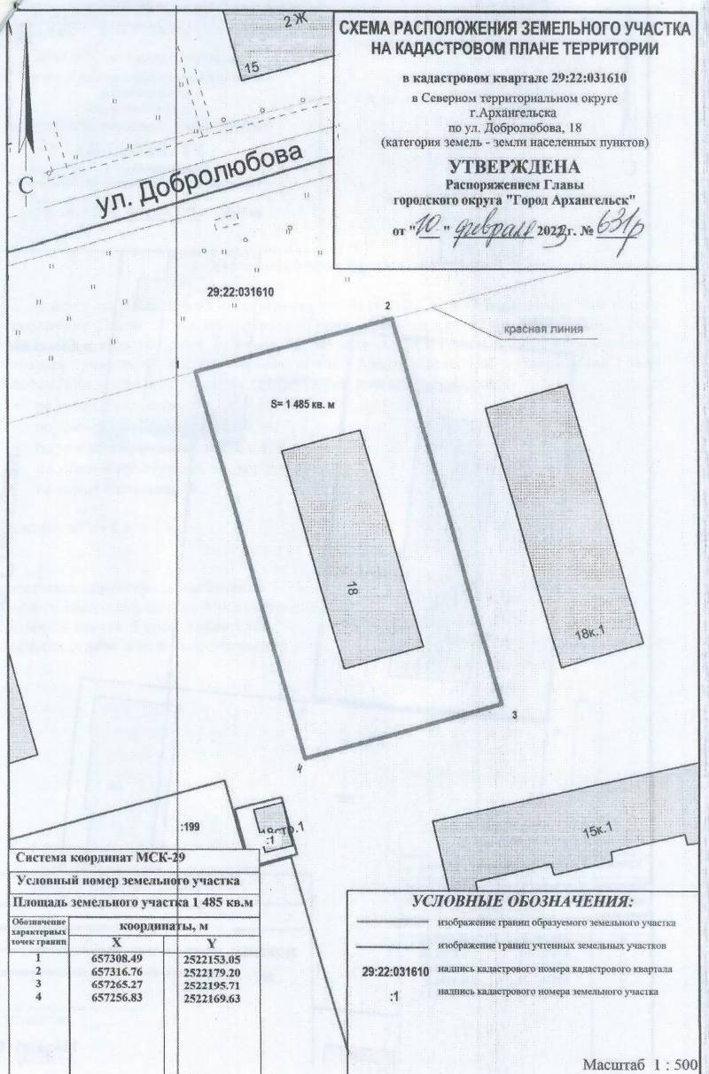 2. Адрес месторасположения земельного участка: г. Архангельск, ул. Добролюбова, д. 18. Данный земельный участок расположен в кадастровом квартале 29:22:031610. Утвержденная схема расположения земельного участка: