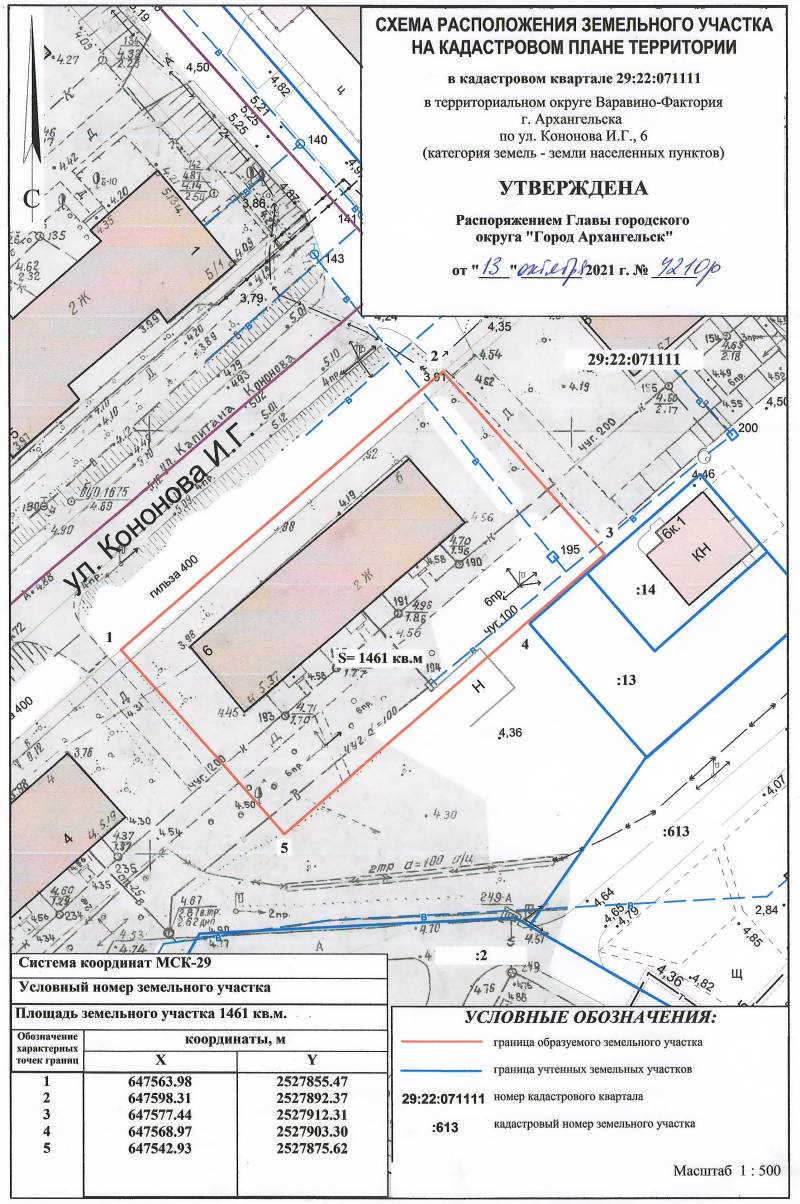 2. Адрес месторасположения земельного участка: г. Архангельск, ул. Кононова И.Г., д. 6. Данный земельный участок расположен в кадастровом квартале 29:22:071111. Утвержденная схема расположения земельного участка: