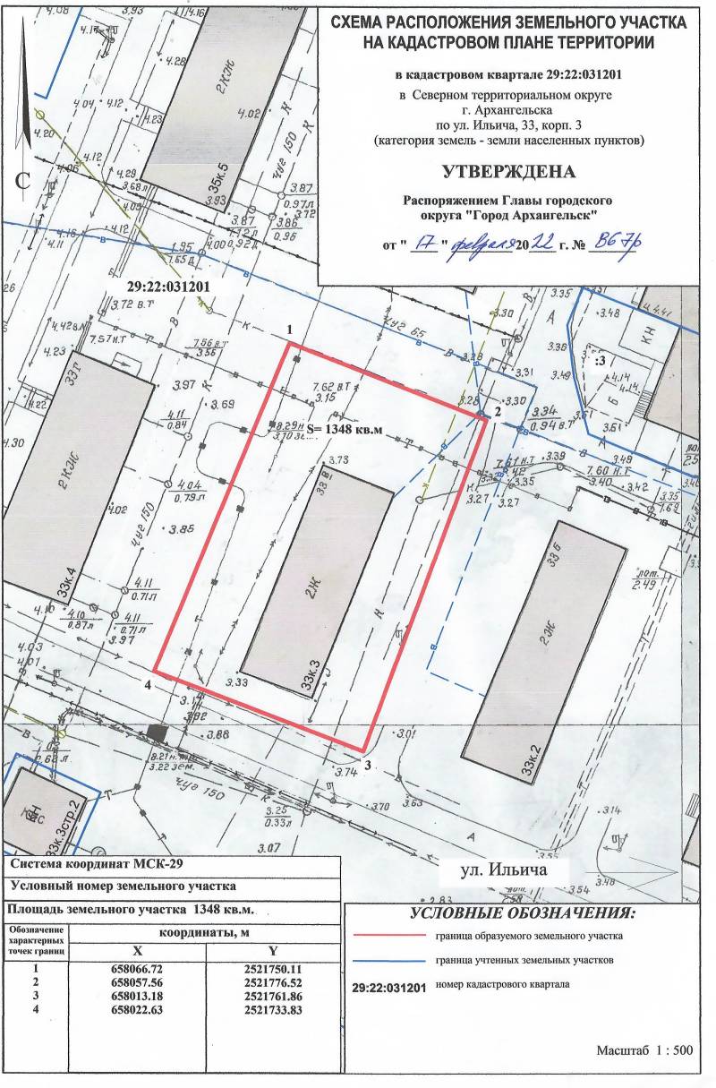 2. Адрес месторасположения земельного участка: г. Архангельск, ул. Ильича, д. 33, корп. 3. Данный земельный участок расположен в кадастровом квартале 29:22:031201. Утвержденная схема расположения земельного участка: