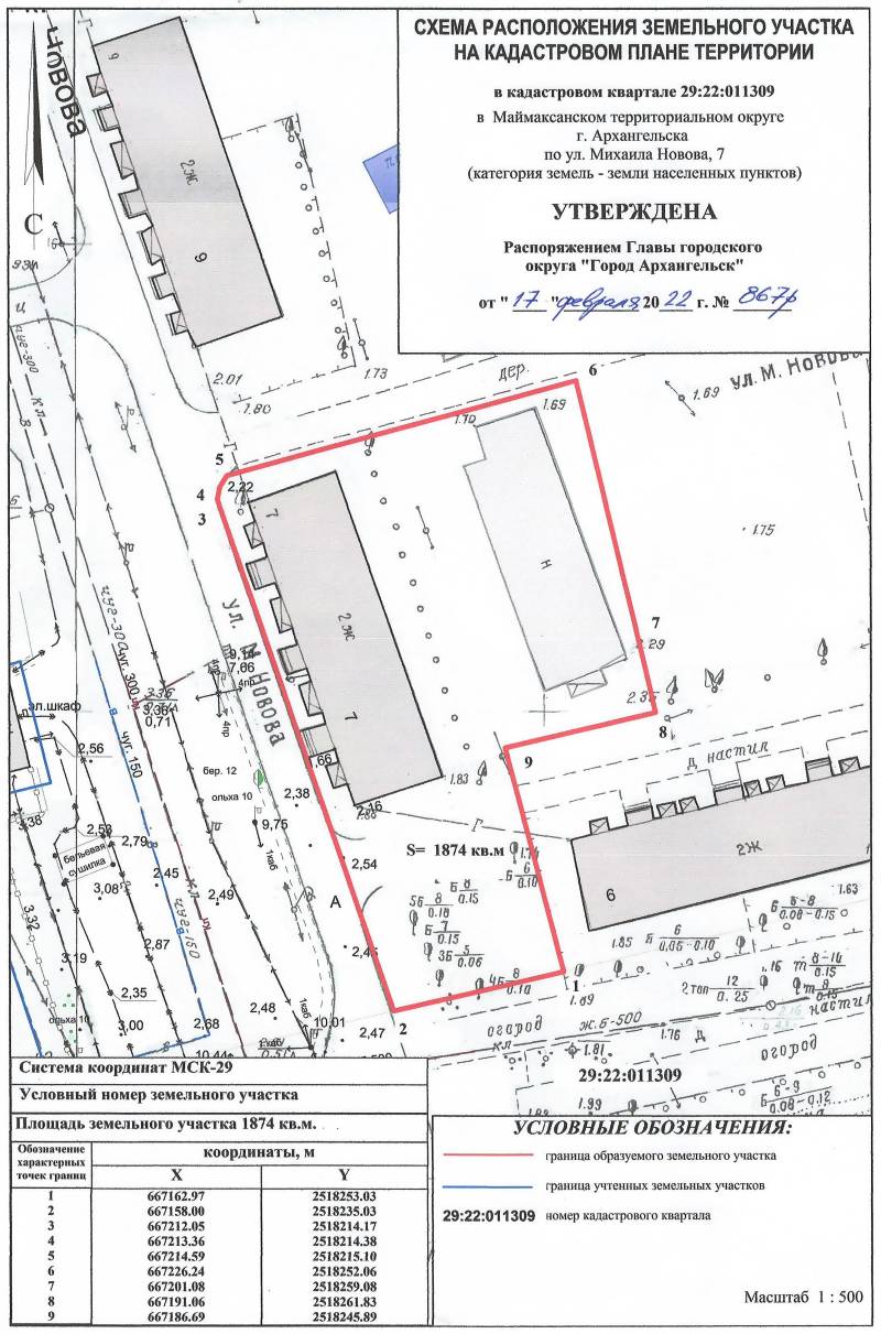 2. Адрес месторасположения земельного участка: г. Архангельск, ул. Михаила Новова, д. 7. Данный земельный участок расположен в кадастровом квартале 29:22:011309. Утвержденная схема расположения земельного участка: