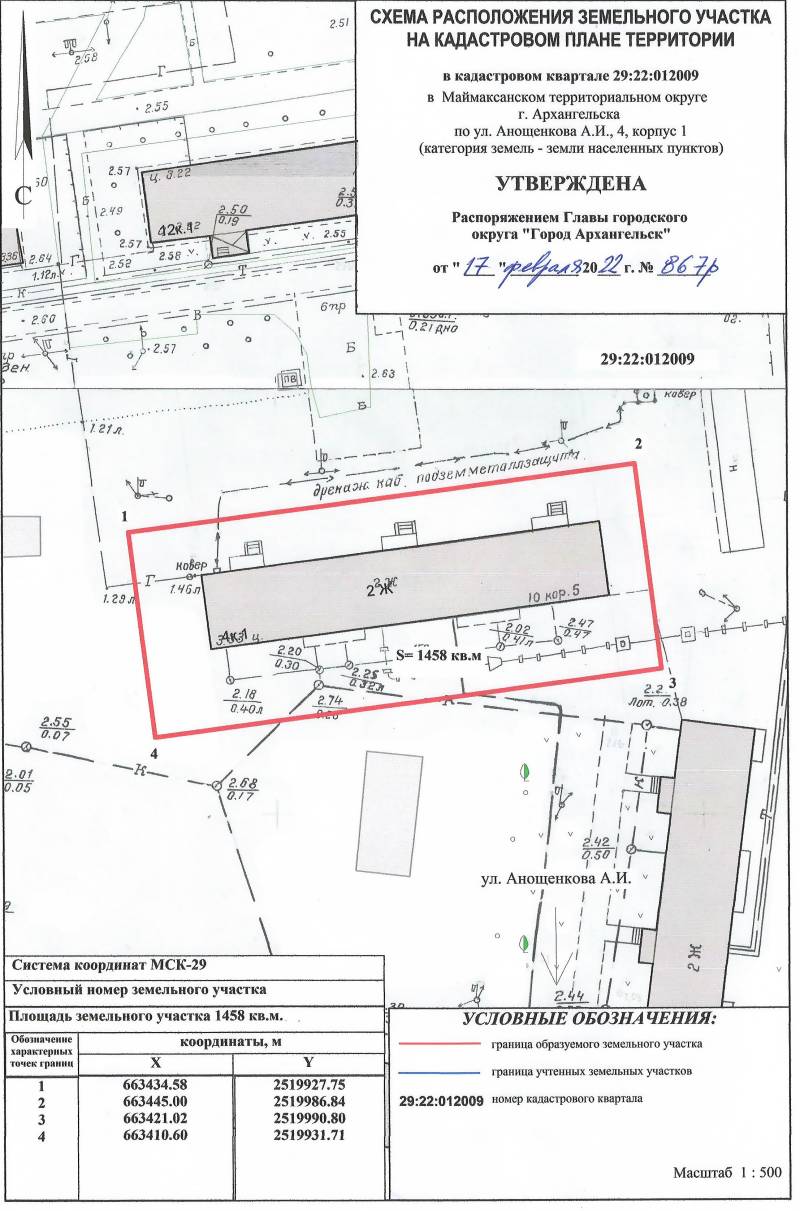 2. Адрес месторасположения земельного участка: г. Архангельск, ул. Анощенкова А.И., д. 4, корп. 1. Данный земельный участок расположен в кадастровом квартале 29:22:012009. Утвержденная схема расположения земельного участка: