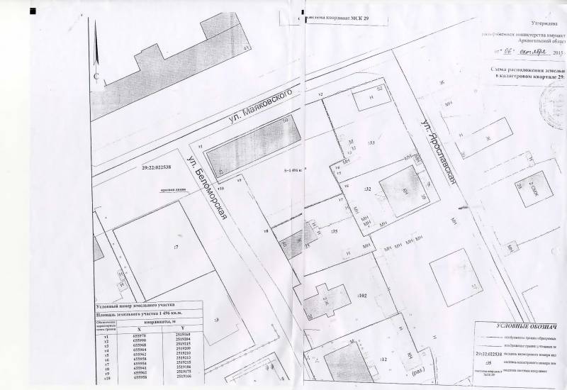 2. Адрес месторасположения земельного участка: г. Архангельск, ул. Маяковского, д. 50/ул. Беломорская, 42. Данный земельный участок расположен в кадастровом квартале 29:22:022538. Утвержденная схема расположения земельного участка: