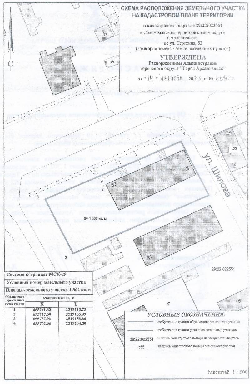 2. Адрес месторасположения земельного участка: г. Архангельск, ул. Терехина, д. 52. Данный земельный участок расположен в кадастровом квартале 29:22:022551. Утвержденная схема расположения земельного участка: