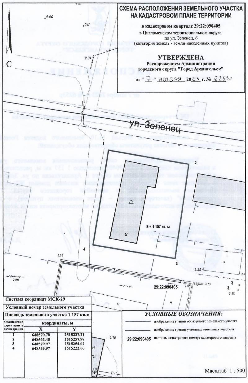 2. Адрес месторасположения земельного участка: г. Архангельск, ул. Зеленец, д. 6. Данный земельный участок расположен в кадастровом квартале 29:22:090405. Утвержденная схема расположения земельного участка: