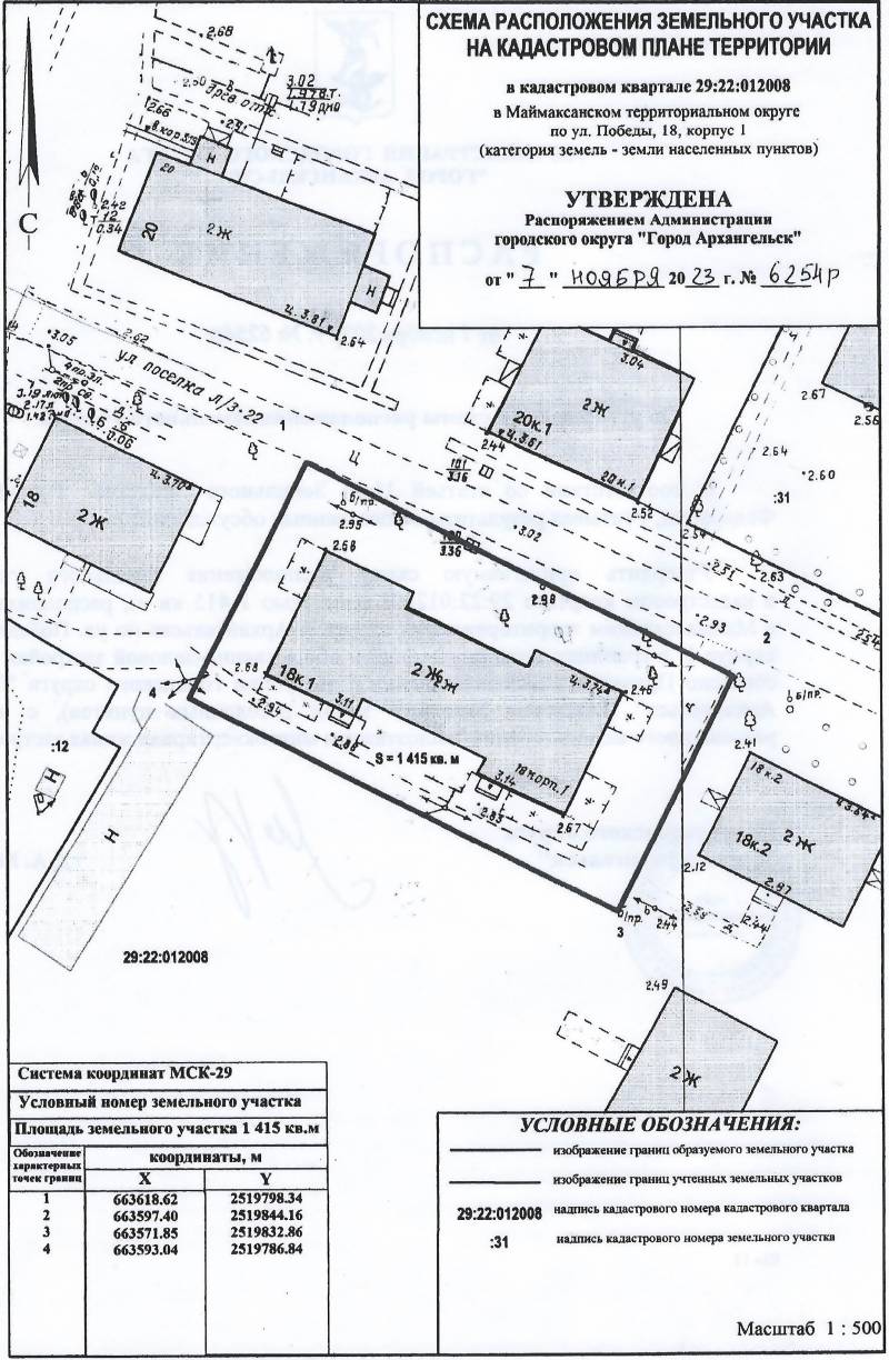 2. Адрес месторасположения земельного участка: г. Архангельск, ул. Победы, д. 18, корп. 1. Данный земельный участок расположен в кадастровом квартале 29:22:012008. Утвержденная схема расположения земельного участка: