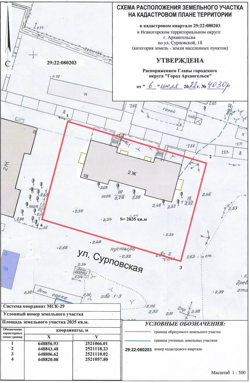 2. Адрес месторасположения земельного участка: г. Архангельск, ул. Сурповская, д. 18. Данный земельный участок расположен в кадастровом квартале 29:22:080203. Утвержденная схема расположения земельного участка: