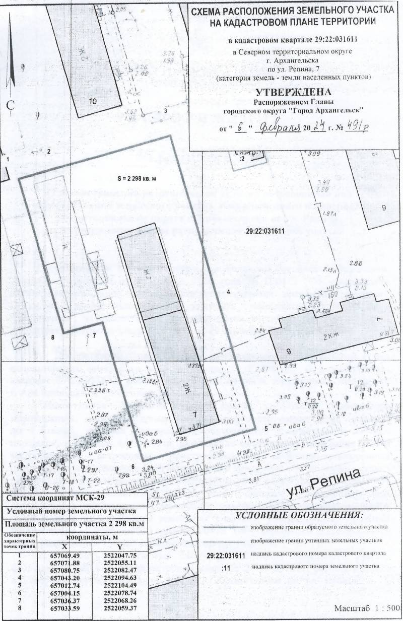 2. Адрес месторасположения земельного участка: г. Архангельск, ул. Репина, д. 7. Данный земельный участок расположен в кадастровом квартале 29:22:031611. Утвержденная схема расположения земельного участка: