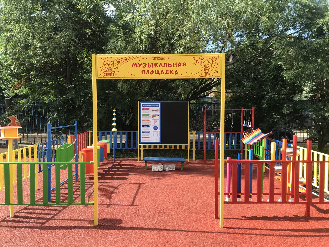 Чего в этом дворике только нет! И настоящая сцена с зрительными местами, и площадка буккроссинга с удобной скамейкой, и фотозоны, и теннисный стол и конечно же музыкальная площадка с различными музыкальными установками: ксилофон, барабаны, пан-флейта, глюкофон, треугольники, колокольчики. В качестве оформления использована входная арка, огоньки, цветы и безопасное покрытие. Получилось уютно и функционально.