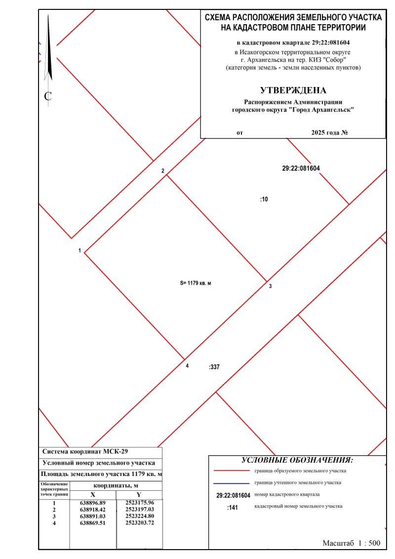 Департамент градостроительства Администрации городского округа "Город Архангельск" извещает о возможности предоставления земельного участка, расположенного в Исакогорском территориальном округе г. Архангельска на тер. КИЗ "Собор" площадью 1 179 кв. м, для индивидуального жилищного строительства согласно представленной схеме расположения земельного участка.