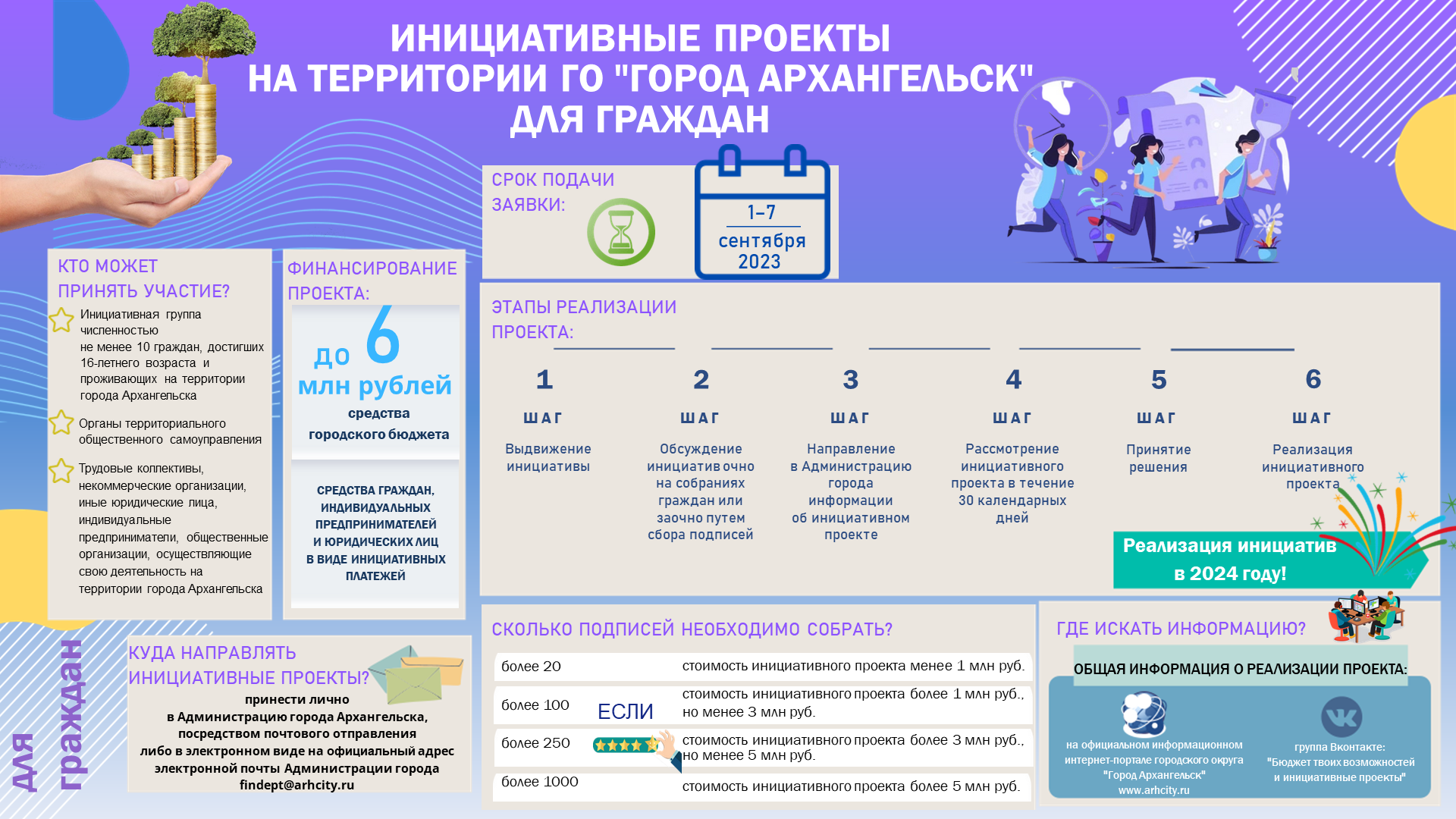 С 1 по 7 сентября - срок подачи заявок на конкурс "Инициативные проекты граждан". Что необходимо сделать предварительно? - сформулировать идею, которую хотелось бы реализовать на территории города Архангельска; - заполнить заявку, которая включает в себя описание идеи, ее значимости, сделать предварительный расчет стоимости реализации инициативы, описать желаемые формы участия граждан . . .