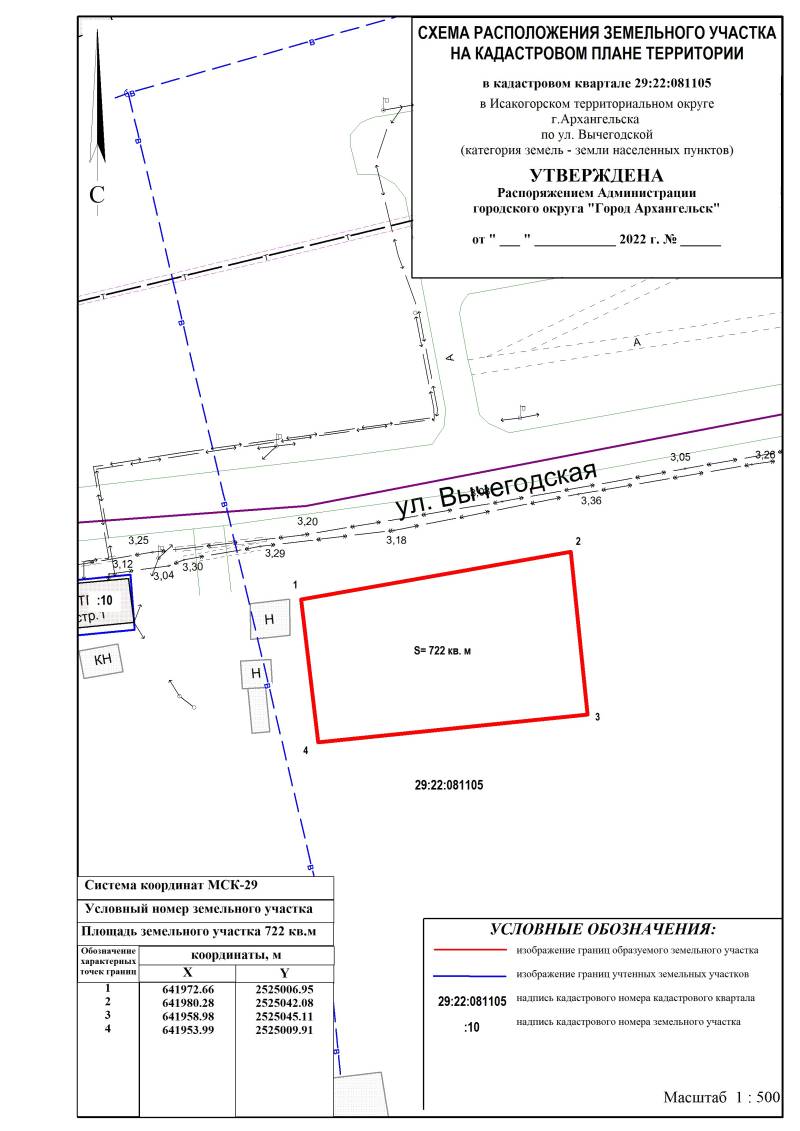 Департамент градостроительства Администрации городского округа "Город Архангельск" извещает о возможности предоставления земельного участка, расположенного Исакогорском в территориальном округе г. Архангельска по ул. Вычегодской в кадастровом квартале 29:22:081105 площадью 722 кв. м, для индивидуального жилищного строительства согласно представленной схеме расположения земельного участка.