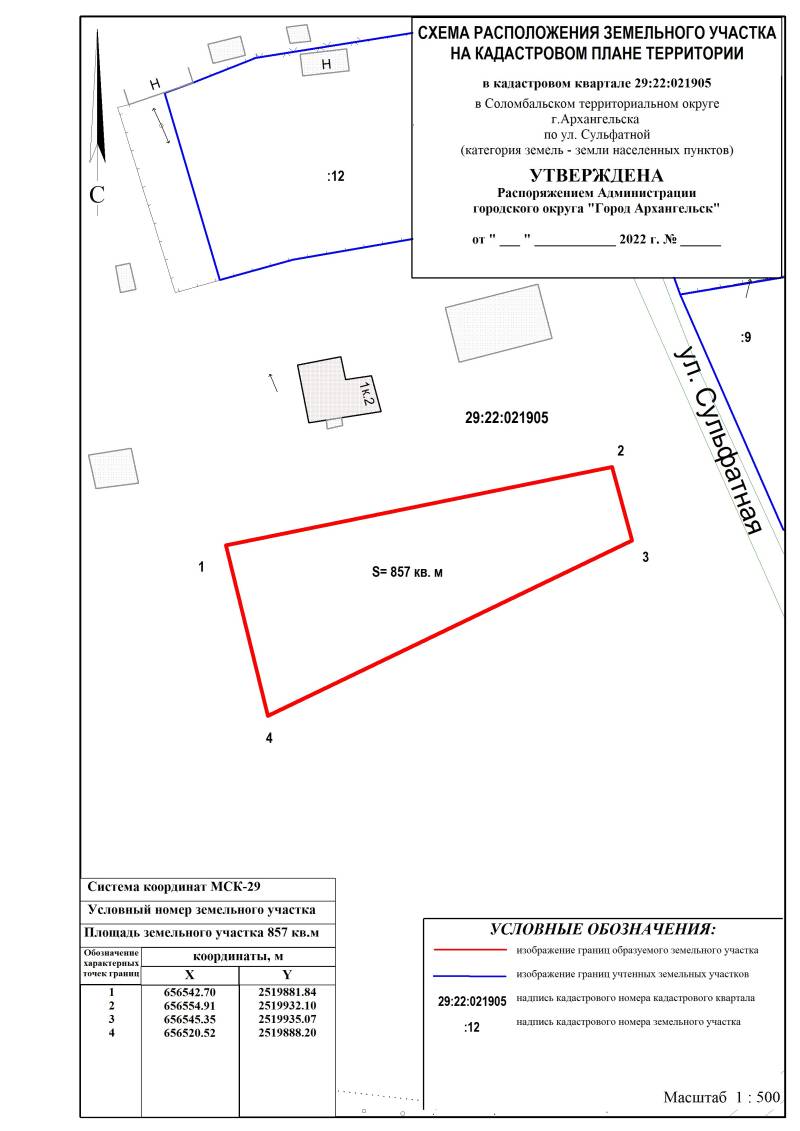 г. Архангельска по ул. Сульфатной в кадастровом квартале 29:22:021905 площадью 857 кв. м, для индивидуального жилищного строительства согласно представленной схеме расположения земельного участка.
