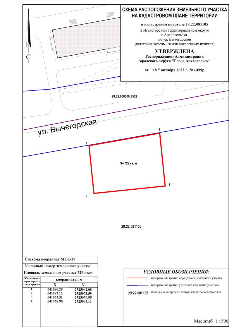 ул. Вычегодской в кадастровом квартале 29:22:081105 площадью 729 кв. м, для индивидуального жилищного строительства согласно представленной схеме расположения земельного участка.