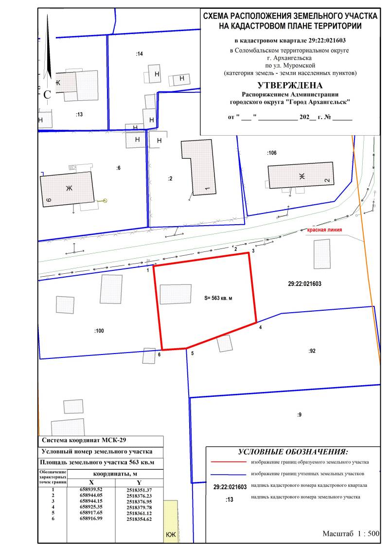 Извещение о предоставлении земельного участка, расположенного в Соломбальском территориальном округе г. Архангельска по ул. Муромской в кадастровом квартале 29:22:021603 площадью 563 кв. м, для индивидуального жилищного строительства