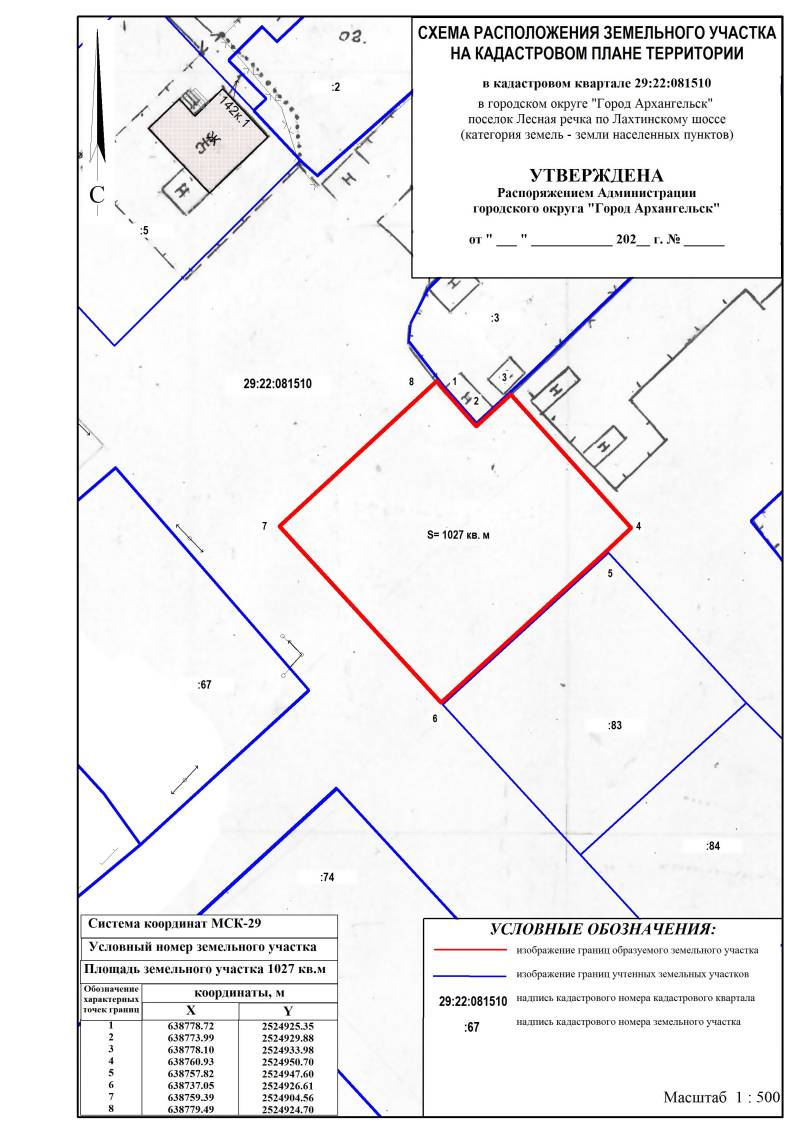 Департамент градостроительства Администрации городского округа "Город Архангельск" извещает о возможности предоставления земельного участка, расположенного в городском округе "Город Архангельск" в поселке Лесная речка по Лахтинскому шоссе в кадастровом квартале 29:22:081510 площадью 1027 кв. м, для индивидуального жилищного строительства согласно представленной схеме расположения земельного участка.