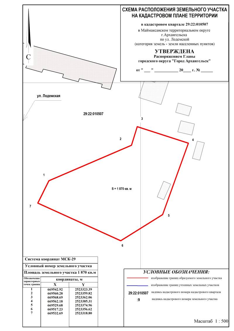 Извещение о предоставлении земельного участка для индивидуального жилищного строительства, расположенного в Маймаксанском территориальном округе г. Архангельска по ул. Лодемской в кадастровом квартале 29:22:010507