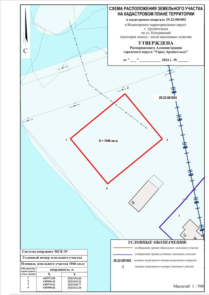 г. Архангельска по ул. Кочуринской, в кадастровом квартале 29:22:081003 площадью 1046 кв. м, для индивидуального жилищного строительства согласно представленной схеме расположения земельного участка.