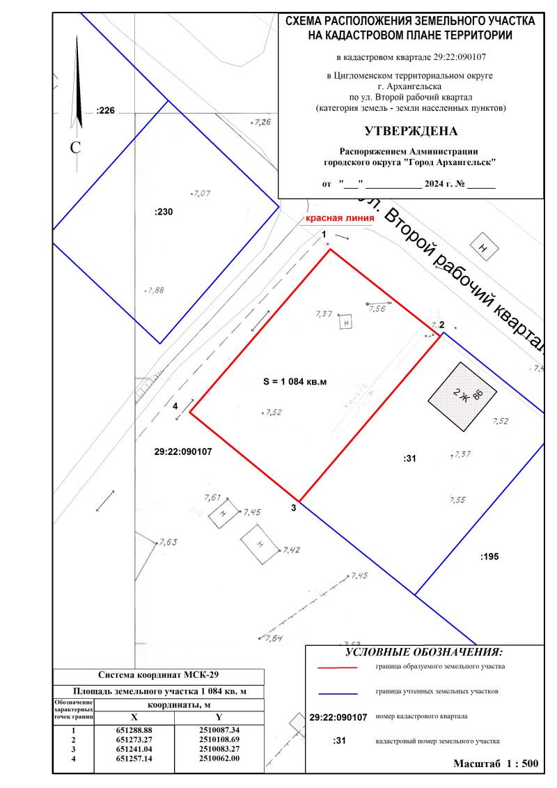 в кадастровом квартале 29:22:090107 в соответствии с прилагаемой схемой расположения земельного участка на кадастровом плане территории, расположенного в Цигломенском территориальном округе г. Архангельска по ул. Второй рабочий квартал,  площадью 1 084 кв. м для индивидуального жилищного строительства.