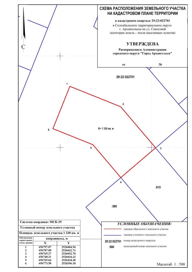 "Город Архангельск" извещает о возможности предоставления земельного участка, расположенного в Соломбальском территориальном округе г. Архангельска по ул. Совхозной площадью 1 330 кв. м, для индивидуального жилищного строительства согласно представленной схеме расположения земельного участка.