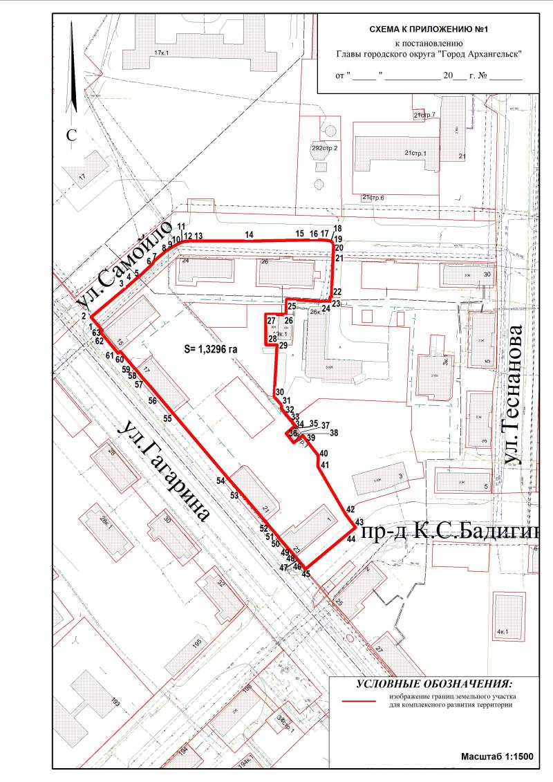 Проект постановления Главы городского округа "Город Архангельск" "О принятии решения о комплексном развитии территории жилой застройки городского округа "Город Архангельск" в границах части элемента планировочной структуры: ул. Гагарина, ул. Самойло, ул. Теснанова, пр-д К.С. Бадигина площадью 1,3296 га, подлежащей комплексному развитию"